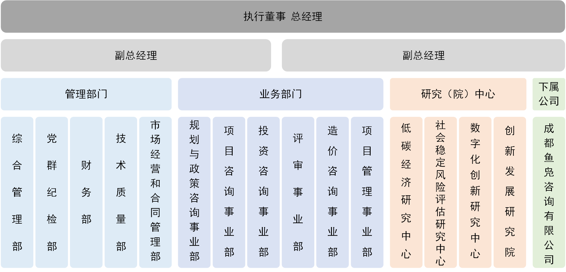 乐鱼(中国)本科及以上学历员工占比93%,硕士及以上学历员工占比47%;正高级工程师7人,高级工程师28人,拥有全国咨询工程师(投资)、全国注册造价工程师以及注册城乡规划师等各类专业技术资格人才占比超过65%。乐鱼(中国)下设11个部门,4个研究(院)中心。其中,业务部门6个,包括规划与政策咨询事业部、项目咨询事业部、投资咨询事业部、评审事业部、造价咨询事业部和项目管理事业部;4个研究(院)中心分别为低碳经济研究中心、社会稳定风险评估研究中心、数字化创新研究中心和创新发展研究院。乐鱼(中国)现有控股子乐鱼(中国)一家,为乐鱼(中国)与温江区属国有乐鱼(中国)合资成立的成都鱼凫咨询有限乐鱼(中国)。